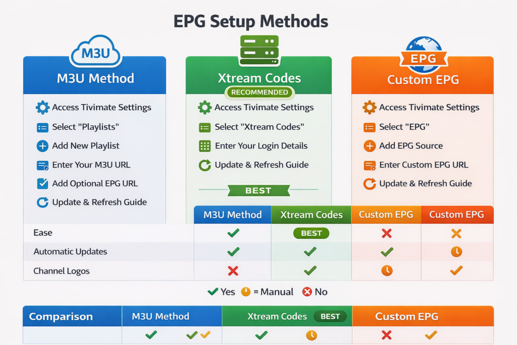 Whether using M3U playlists with separate EPG URLs or Xtream Codes with automatic guide data, following the correct process ensures reliable program information every time you open TiviMate.