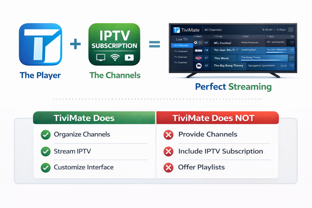 Think of it like this — TiviMate is the TV screen. Your IPTV subscription is the cable connection. Without the cable, the screen is blank. Both pieces are required before anything plays.