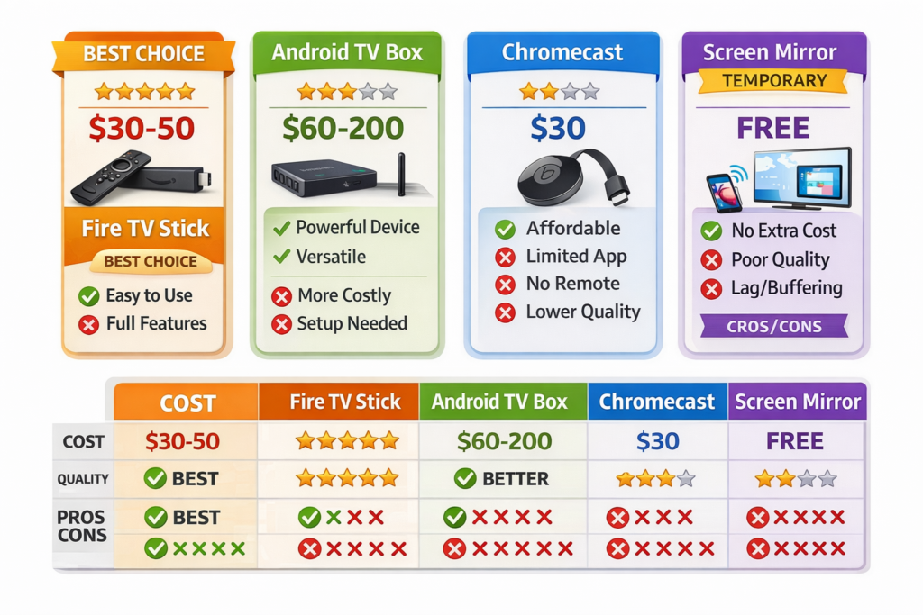 | Fire TV Stick | $30-50 | Very Easy | Excellent | Most users |